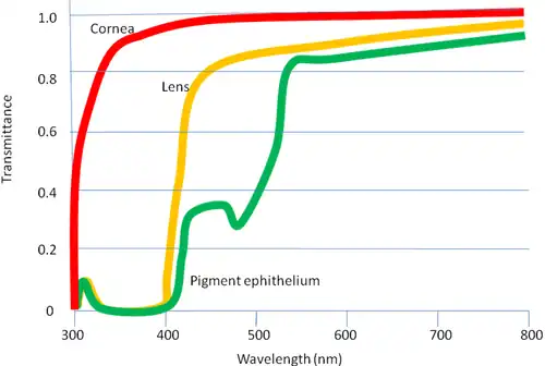 Antes de haver transdução, as ondas EM têm de passar pela córnea, pelo cristalino e pela mácula. Estas estruturas também funcionam como filtros que ajudam a diminuir a quantidade de ondas EM indesejáveis, protegendo assim o olho de radiações possivelmente nocivas. Na figura acima, é possível observar que a córnea atenua os comprimentos de onda menores, afectando apenas minimamente cumprimentos de onda maiores. O cristalino bloqueia cerca de 25% das ondas EM abaixo dos 400 nm e mais de 50% das ondas abaixo dos 430 nm. Finalmente, o epitélio pigmentado, que representa o último filtro antes de haver fotorrecepção, afecta cerca de 30% das ondas entre os 430 e os 500 nm.
