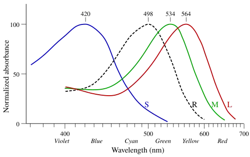 - Os cones de tipo S absorvem luz com um comprimento de onda curto, isto é, luz azul-violeta. A absorção máxima dá-se com o comprimento de onda 420 nm.