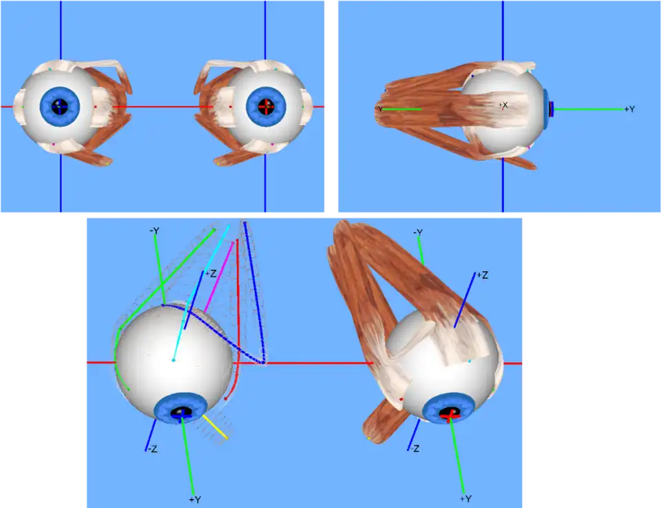 Como é possível ver, os músculos extra-oculares (2,3,4,5,6,8) possuem uma inserção na esclera e originam-se no tendão de Zinn, um tendão fibroso que rodeia o nervo óptico. Um sistema de polia é criado com a tróclea enquanto polia e o músculo oblíquo superior actuando como corda (esta construção é necessária para dirigir a força muscular de forma correcta). Os músculos extra-oculares restantes não formam este sistema de polia. Usando estes músculos extra-oculares, o olho pode ser rodado para cima, baixo, para a esquerda, para a direita e vários outros movimentos que resultem das combinações destes primeiros podem ser efectuados.
