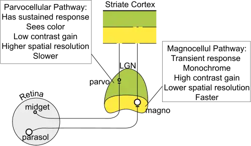 - ↑ Livingstone, Margaret S and Hubel, David H (1987). "Psychophysical evidence for separate channels for the perception of form, color, movement, and depth". The Journal of Neuroscience 7 (11): 3416-3468.