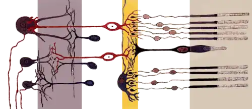 À direita encontra-se uma ilustração conceptual das estruturas da retina. Como pode ser observado, existem cinco principais tipos de células: