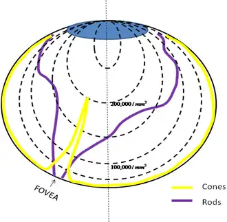 As células fotorreceptoras podem por sua vez ser divididas em dois subtipos: os cones e os bastonetes. Os cones encontram-se em menor número na maioria da retina, mas formam um enorme agregado na mácula, especialmente na porção central da fóvea. Nesta região central, cada cone está conectado a uma única célula ganglionar. Por outro lado, os cones desta região são ligeiramente mais pequenos que o cone médio, aumentando a sua concentração na fóvea. É exactamente por causa deste rácio cone/célula ganglionar e da alta concentração de cones na fóvea que é nesta região que apresentamos a maior acuidade visual.