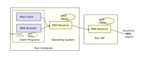 Por causa do enorme tráfego gerado por sistema como o DNS, principalmente nos servidores mais altos na hierarquia foi usado um sistema de cache. Assim, por um período de tempo (gerenciado pelo administrador) as respostas do DNS ficam armazenadas como válidas. Dessa forma antes de consultar um servidor DNS máquina irá buscar no cachê da máquina se já não existe um registro para esta busca ou pelo menos para parte dela. Usuários não se comunicam diretamente com o DNS resolver. A resolução de nomes se dá de forma transparente nas aplicações. Quando numa requisição se faz necessário consultar um DNS, a aplicação requisita o DNS resolver local do Sistema Operacional. O sistema DNS usa TCP e UDP na porta 53 para servir requisições. Quase todas as requisições DNS consitem em um pacote UDP, e é respondida ao cliente também através de outro pacote UDP. TCP só é usado quando a resposta excede 512 bytes, ou para tarefas específicas como transferências de zonas.
