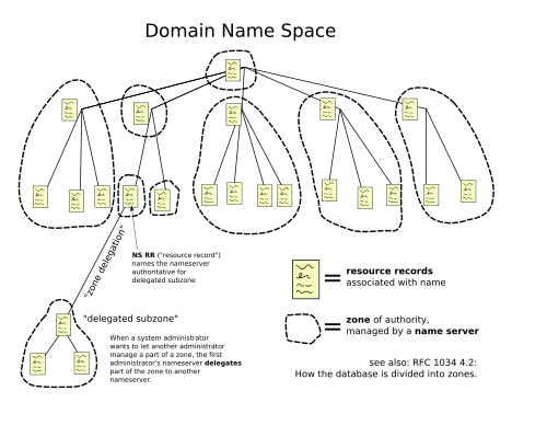 | O espaço de nomes do domínio consiste em uma árvore de nomes. Cada nó tem um ou mais registros de recursos, que tem informações sobre o domínio. A árvore é subdividida em zonas, sendo esta um conjunto de nós que são servidos por um DNS superior. Quando um administrador quer delegar parte de seu domínio a outro administrador, ele usa este recurso de zonas para tal.