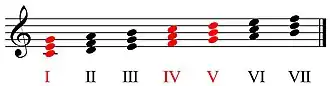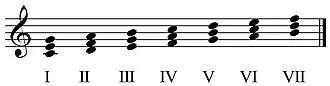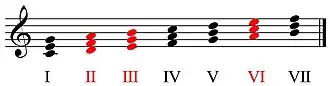 - Tríade maior: um intervalo de 3ª maior sob um intervalo de 3ª menor, formando o intervalo de 5ª justa entre a primeira e a terceira nota da tríade. É encontrado nos graus I, IV e V da escala diatônica maior e nos graus V e VI da escala menor harmônica.