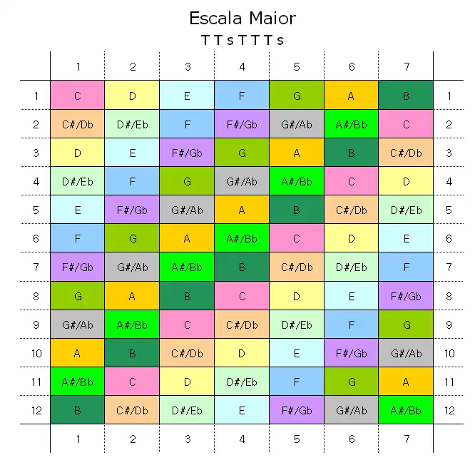 A partir da escala maior é que são formados os acordes maiores. A escala fundamental do modo maior é a escala de Dó maior, uma vez que a relação de intervalos desse modo pode ser obtida nesta escala sem a necessidade de nenhuma alteração de altura. Veja na figura abaixo as notas dessa escala e sua sequência de intervalos na sequência de intervalos: