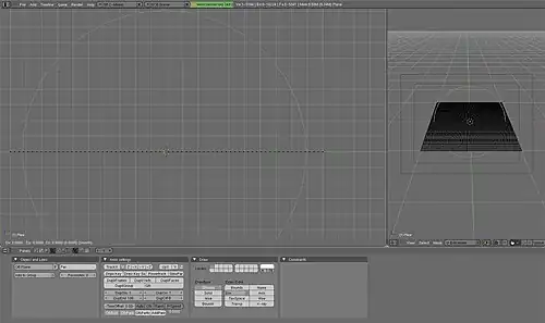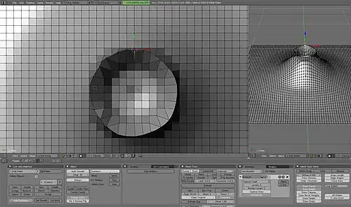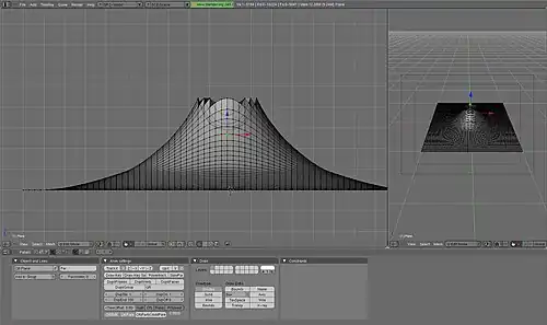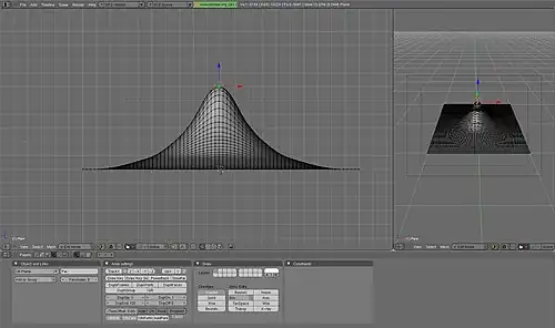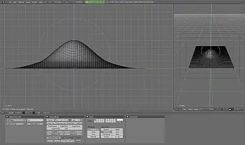 Com a vista superior ativa, selecione um dos pontos no meio do plano. Com este ponto selecionado mude para a vista lateral. E agora começa a diversão. Pressione O. (Você deve ver, agora, um pequeno ponto amarelo no menu do painel da 3D View.) Ele permite acesso à edição da ferramenta proportional falloff. Se você mover um vértice enquanto este estiver selecionado todos os vértices em um determinado raio serão influenciados pelo mesmo movimento. E a proporção desta influência pode ser escolhida na aba à direita do ponto amarelo. Proponho usar o smooth falloff .