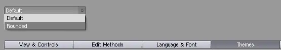 Agora, clique e arraste a borda do cabeçalho para baixo para revelar o menu de configurações do Blender. Clique no botão "Themes" e na caixa de listagem que aparece, escolha "Rounded".