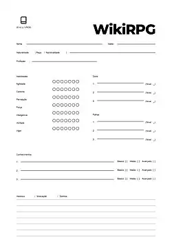 - Nome : Nome do PdJ . Geralmente os jogadores tem liberdade para escolher o nome dos seus personagens ,ainda que seja conveniente obedecer um certo padrão de acordo com o cenário . (Seria muito estranho termos um Chewbacca na Idade Média ).