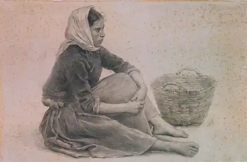 Nota-se comparativamente à obra final um menor número de figuras para além da figura central da rapariga, vendo-se ainda barcos na água que depois foram retirados.