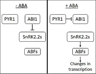 Na ausência de ABA, a fosfatase ABI1-INSENSITIVE1 (ABI1) inibe a ação das proteínas cinases relacionadas a SNF1 (subfamília 2) (SnRK2s). O ABA é percebido pelas proteínas de membrana PYRABACTIN RESISTANCE 1 (PYR1) e do tipo PYR1. Na ligação ABA, PYR1 se liga a e inibe ABI1. Quando os SnRK2s são liberados da inibição, eles ativam vários fatores de transcrição da família ABA RESPONSIVE ELEMENT-BINDING FACTOR (ABF). Os ABFs então causam mudanças na expressão de um grande número de genes.[2] Acredita-se que cerca de 10% dos genes das plantas sejam regulados pelo ABA.[carece de fontes]