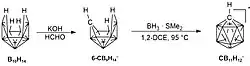 Em 2010, Reed publicou um guia com procedimentos detalhados para a síntese de ácidos carborano e seus derivados.[15] No entanto, a síntese de ácidos carborano permanece demorada e difícil e requer um porta-luvas bem conservado e alguns equipamentos especializados. O material de partida é o decaborano(14) comercialmente disponível, uma substância altamente tóxica.