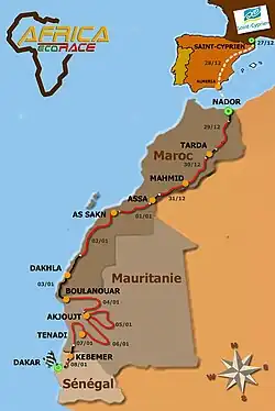 O Rali África Eco Race, destina-se a amadores e profissionais, desenrolando por mais de 6500 km, durante 11 etapas[4]. A corrida atravessa os territórios de Marrocos, Mauritânia e Senegal.