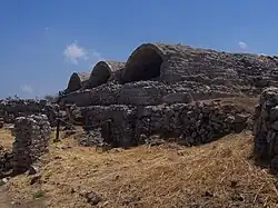 Pashley conseguiu localizar vários túmulos facilmente e descreveu dois: o primeiro foi construído para acolher três corpos e o segundo quatro corpos.[37] Os túmulos mais antigos, que atestam a data da fundação da cidade, remontam ao período geométrico, no século VIII a.C. O morto era geralmente colocado dentro de um grande pito, que era posto num túmulo escavado na rocha. Ao lado do pito eram colocadas oferendas, usualmente peças de olaria bastante simples. Nos períodos seguintes, entre os séculos VII e século I a.C., o tipo de túmulo mais frequente foi o retangular, escavado numa rocha mole e coberto com um bloco de pedra. Há também túmulos com paredes e cobertura construídas com blocos espessos de pedra (cistas). Há ainda um terceiro tipo de túmulo, mais simples, que consiste em telhas juntas em volta do corpo do defunto, onde assenta a cobertura. Este último tipo era usado pelas famílias mais modestas.[15][35]