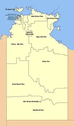 Exstem 17 LGAs no Território do Norte, mais a área não incorporada na região de Darwin e na Austrália Central. LGAs podem ser cidades designadas, municipalidades, regiões ou não ter designação, mas em legislação todas as LGAs são classificadas como Metrópole (C), Cidades (T) e Vilas (S). Existem apenas conselhos que são considerados municípios.