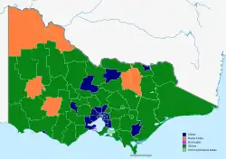 Existem 79 Áreas de governo local no estado australiano de Vitória. LGA's se constituem como cidades, shires (condados), cidades rurais e, em um caso, um borough. Além das LGAs, há também um número de pequenas áreas não-incorporadas; incluindo Monte Hotham e Falls Creek (rodeado pelo Alpine Shire), Monte Buller (rodeado por Shire de Mansfield), Ilha Francesa, a Yallourn área de trabalho e Ilha Lady Julia Percy.[1]