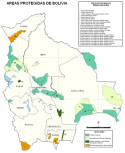 A Bolívia conta com 66 dos 112 ecossistemas terrestres existentes em todo mundo,[1] e com mais de 123 áreas protegidas que juntas cobrem cerca de 20% do território nacional.[2] Em anos recentes a concessão de autorizações para que companhias de exploração mineral e petrolífera atuem no interior de parques nacionais tem sido duramente criticada, sendo notícia em diversos países.[3][4]