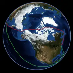 Duas definições do Ártico: Linha vermelha - Região a norte da isotérmica dos 10 graus como temperatura média em julho. Linha azul - Região a norte do Círculo Polar Ártico.