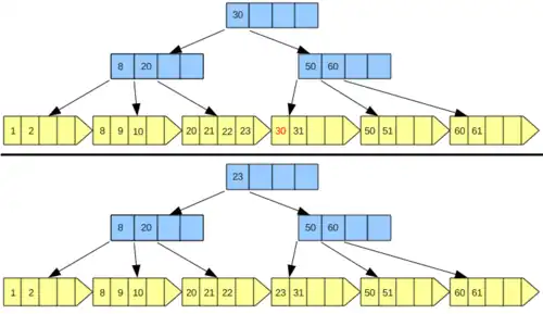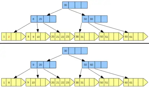 A seguir são demonstrados dois exemplos de redistribuição de chaves nas figuras 4 e 5. Quando ocorrido o underflow na página e a possibilidade de redistribuir as chaves entre páginas irmãs é constatada, devemos alterar o valor da chave separadora dessas páginas adjacentes para o menor valor da página à direita resultante. Isso somente é possível porque a página em que foi removida a chave tem uma página irmã com um número maior de chaves do que o mínimo permitido.
