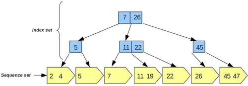O index set, como dito anteriormente, apenas carrega cópias de chaves para referenciar a busca e sua construção é semelhante ao de uma árvore B. Suponhamos que estes nós internos possam apontar para n nós filhos, ou seja, uma árvore B com no máximo n-1 chaves por página.
