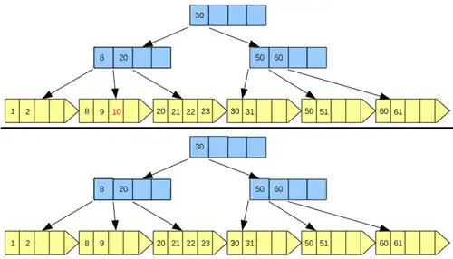 Portanto, conhecido a chave que separa duas páginas adjacentes, sabemos que após uma operação de remoção pode-se ocorrer underflow em suas páginas folha e se isso ocorrer devemos aplicar a redistribuição de chaves entre o sequence set ou concatenar o conteúdo de páginas adjacentes.