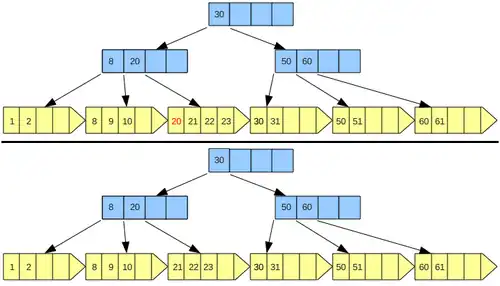 Na figura 6, apesar da remoção da chave 20, não ocorre o underflow na página e ainda assim o separador 20 no index set é um bom separador para futuras buscas na árvore.