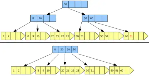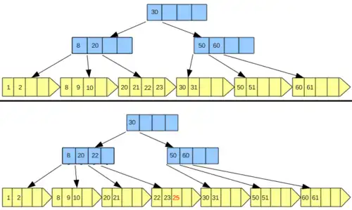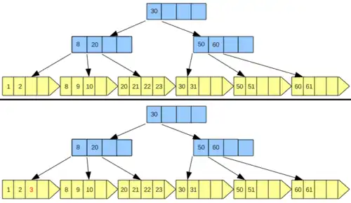- Página folha completa: A página folha em questão deve sofrer uma operação de split. Tal operação cria uma nova página em arquivo dividindo as chaves entre a nova página e a anterior. Assim devemos escolher uma chave intermediária da sequência formada por todas as chaves da página folha inclusive a chave a ser inserida e distribuir essas chaves de maneira que a nova página contenha a chave intermediária e as chaves maiores do que ela e a página anterior contenha as chaves menores do que a chave intermediária. Após isso a chave intermediária deve ser inserida no index set semelhante ao processo de inserção em árvores B. Caso da figura 2.