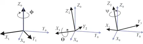 onde é o vetor posição no sistema ligado ao corpo e é o vetor posição no sistema inercial. A matriz de rotação descreve a orientação relativa dos dois sistemas. A matriz de rotação é definida pelo produto matricial de três rotações elementares descritas pelos ângulos de Euler α, β, γ: