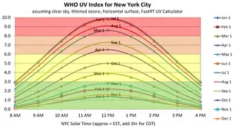 O índice ultravioleta (IUV) é um padrão internacional de medição da força de raios ultravioleta (UV) em um determinado lugar e tempo. A escala foi desenvolvida por cientistas canadianos[2] em 1992, aprovada e padronizada pela Organização Mundial de Saúde e Organização Meteorológica Mundial em 1994. Ele é usado principalmente em previsões diárias destinadas ao público em geral, e está cada vez mais disponível como uma previsão de hora em hora.