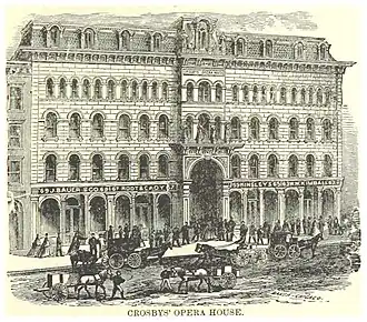 Crosby's Opera House (1865–1871) foi uma casa de ópera em Chicago, Illinois, Estados Unidos. Foi fundada por Uranus H. Crosby em 1865 com o objetivo de promover as artes em Chicago, trazendo a ópera para a cidade.[1] O edifício de cinco andares foi projetado por William W. Boyington e continha estátuas de pintura, escultura, música e comércio que davam as boas-vindas aos visitantes que entravam pelo arco do edifício. Depois de realizar apresentações apenas ocasionais, Crosby enfrentou muitas dificuldades comerciais que resultaram na decisão de vender o prédio em 1866. A Crosby Opera House Art Association foi formada para ajudar Crosby a vender o prédio por sorteio.[1] A loteria distribuiu mais de 210 mil bilhetes, premiando os compradores com grandes obras de arte e até o próprio prédio.[2] Depois de ser vendido de volta para Crosby pelo ganhador da loteria, AH Lee, o salão começou a produzir performances mais consistentes. A casa de ópera durou menos de seis anos e meio antes de ser destruída no Grande Incêndio de Chicago em 1871 e nunca mais ser reconstruída.