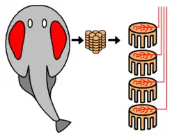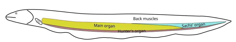 Os órgãos elétricos são compostos por pilhas de células especializadas que geram eletricidade[13] e são chamados de eletrócitos, eletroplacas ou eletroplaxes. Em algumas espécies, eles têm formato de charuto; em outras, são células planas em forma de disco. As enguias elétricas têm milhares dessas células, cada uma produzindo 0,15 V. As células funcionam bombeando íons de sódio e potássio através de suas membranas celulares por meio de proteínas de transporte, consumindo trifosfato de adenosina (ATP) no processo. Pós-sinapticamente, os eletrócitos funcionam de forma muito semelhante às fibras musculares, despolarizando com um influxo de íons de sódio e repolarizando em seguida com um fluxo de íons de potássio, mas os eletrócitos são muito maiores e não se contraem. Eles têm receptor nicotínico de acetilcolina.[13]
