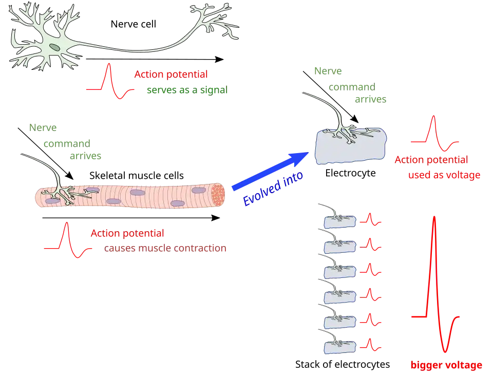 Os órgãos elétricos de todos os peixes-elétricos são derivados do músculo esquelético, um tecido eletricamente sensível, exceto no Apteronotus (América Latina), em que as células são derivadas do tecido neural.[13] A função original do órgão elétrico não foi totalmente estabelecida na maioria dos casos; no entanto, sabe-se que o órgão do bagre de água doce africano do gênero Synodontis evoluiu a partir de músculos produtores de som.[26]