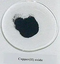 O óxido de cobre(II) (CuO) é o óxido de cobre de maior estado de oxidação. Como um mineral, é conhecido como tenorita.