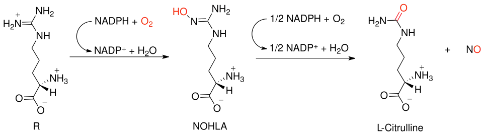 Óxido nítrico sintase produz NO catalisando uma oxidação de cinco elétrons de um nitrogênio guanidino de L-arginina (L-Arg). A oxidação de L-Arg a L-citrulina ocorre via duas reações de monooxigenação sucessivas produzindo Nω-hidroxi-L-arginina (NOHLA) como um intermediário. 2 mol de O2 e 1.5 mol de NADPH são consumidos por mol de NO formado.[6]