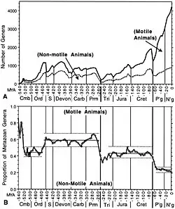 Existe um amplo consenso sobre a trajetória geral da diversidade de animais marinhos Fanerozóicos. Este padrão é mais famoso na compilação de Sepkoski sobre a diversidade de famílias marinhas ao longo do tempo, mas é igualmente claro em nossa tabulação de seus dados sobre gêneros marinhos. Após várias fases de diversificação abrangendo o último Proterozóico até o Ordoviciano Médio, a riqueza taxonômica de animais marinhos preservados flutuou, mas não exibiu nenhuma tendência secular de aumento ou diminuição, durante os próximos 200 milhões de anos. Após a catastrófica extinção do final do Permiano, a diversidade marinha aumentou quase continuamente durante mais de 200 milhões de anos, apenas com retrocessos transitórios.
