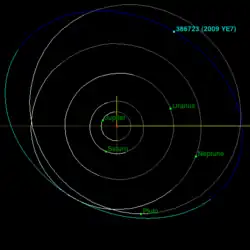 A órbita de (386723) 2009 YE7 tem uma excentricidade de 0,144 e possui um semieixo maior de 44,294 UA. O seu periélio leva o mesmo a uma distância de 37,894 UA em relação ao Sol e seu afélio a 50,695 UA.[1]