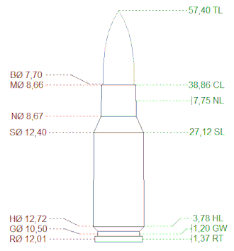 | Comprimento do estojo | 2,260 in (57,4 mm) | |