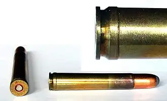 - ↑ Barnes, Frank C. (2009). Cartridges of the World (em inglês) 12.ª, revisada ed. [S.l.]: Krause Publications (publicado em 20 de outubro de 2009). 568 páginas. ISBN 978-0-89689-936-0. Consultado em 24 de abril de 2021