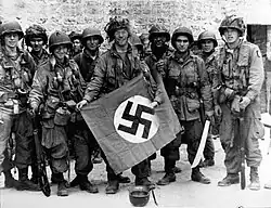 Paraquedistas da 101.ª Divisão posam com um sinal de identificação aérea de um veículo nazi capturado dois dias após o desembarque na Normandia.