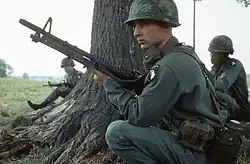 Um membro da 101.ª Divisão Aerotransportada, armado com uma metralhadora M60, participa num exercício de campo em 1972. Vê-se ainda uma M16A1 no fundo, e cada soldado com um capacete M1.