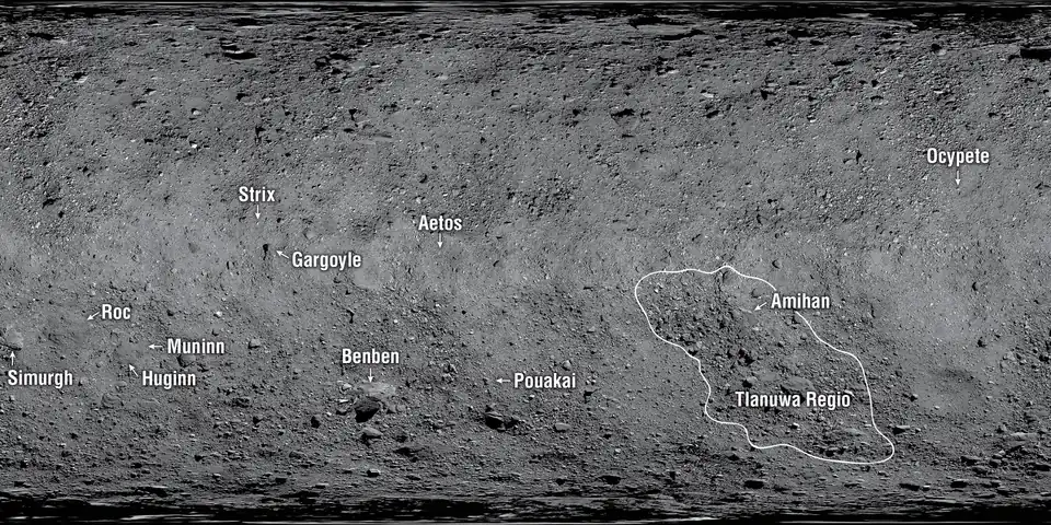 Mosaico global do Benu mostrando as localizações das 12 primeiras características de superfície a serem nomeadas
