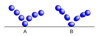 Exemplo A mostra uma bola quicando com um movimento rígido, não dinâmico. No exemplo B, a bola é "comprimida" pelo impacto, e "esticada" durante a queda e o rebote. O movimento também acelera durante a queda, e desacelera em direção ao ápice (o princípio da "aceleração e desaceleração").