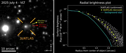 Painel direito: A aparência difusa de 3I/ATLAS pode ser vista em seu perfil radial de brilho, que traça o brilho superficial em relação ao raio. O brilho superficial de 3I/ATLAS se estende a um raio maior comparado a uma estrela de fundo com o mesmo brilho de pico, portanto o cometa deve possuir uma coma.