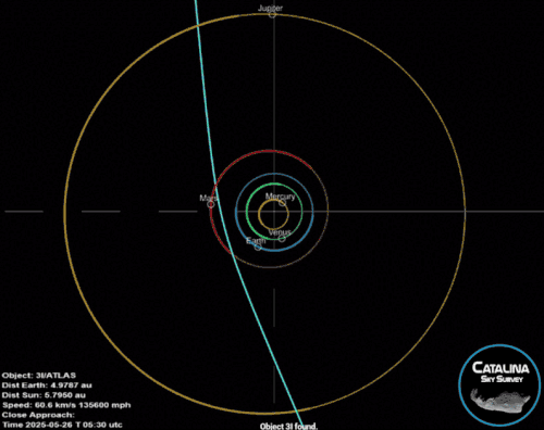 3I/ATLAS, também conhecido como C/2025 N1 (ATLAS) e anteriormente como A11pl3Z, é um cometa interestelar[3][4] descoberto pela estação do Asteroid Terrestrial-impact Last Alert System (ATLAS) em Río Hurtado, Chile, em 1 de julho de 2025. Quando foi descoberto, estava entrando no Sistema Solar interior a uma distância de 4,5 AU (670 milhões de km) do Sol. O cometa segue uma trajetória hiperbólica não vinculada ao redor do Sol, com um excesso hiperbólico de velocidade muito alto de 58 km/s (36 mi/s) em relação ao Sol.[5][a] 3I/ATLAS não se aproximará mais do que 1,8 AU (270 milhões de km) da Terra, portanto não representa ameaça.[6] É o terceiro objeto interestelar confirmado a passar pelo Sistema Solar, após 1I/ʻOumuamua (descoberto em outubro de 2017) e 2I/Borisov (descoberto em agosto de 2019),[7] daí o prefixo "3I". Não se espera que brilhe o suficiente para se tornar visível com binóculos ou a olho nu. Durante a conjunção solar no dia 21 de outubro de 2025, o cometa pôde ser observado pelo satélite meteorológico GOES-19.[8]