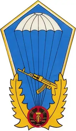 Após cinco saltos, o distintivo de salto de paraquedas era concedido. Houve seguidores adicionais para o número de saltos alcançados em cada caso com 10; 25, 30; 35; 40; 50; 75; 100; 150 e depois em incrementos adicionais de 50. Em 1972, o Ministro da Defesa Nacional ordenou a revisão do uniforme com base nas chamadas sugestões inovadoras das tropas (em alemão: Neuererwesen). O novo traje de combate era composto por quatro partes (jaqueta, calça, colete de combate, capa de chuva), estampadas no chamado padrão de camuflagem de linha (em alemão: Strichtarnmuster). A característica distintiva dos pára-quedistas do NVA era seu capacete especial e de ajuste apertado para paraquedistas (em alemão: Fallschirmspringerhelm), fabricado na Polônia. Tendo sido usado desde 1975.