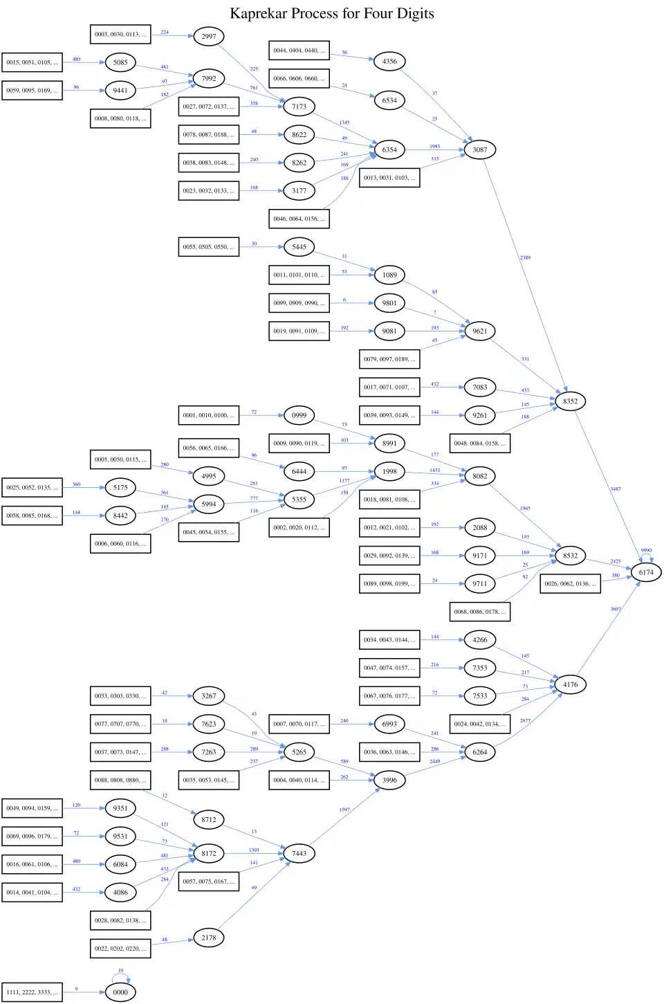 Os únicos números a quatro dígitos para os quais a rotina de Kaprekar não leva a 6174 são dígitos repetidos tais que 1111, 2222, etc, que levam ao resultado 0 após uma simples iteração. Todos os outros números a quatro dígitos eventualmente levam a 6174 se zeros complementares iniciais forem usados para manter os números a quatro dígitos: