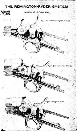 O Remington Rolling Block rifle foi uma das armas de tiro único de maior sucesso já desenvolvidas. É uma ação pivotante forte e simples, muito confiável e não sujeita a ser obstruída por sujeira ou uso pesado. Foi baseado em parte na ação de ""split breech"" ("câmara dividida") produzida pela Remington durante a Guerra Civil Americana.[3] Esse projeto foi reprojetado por Joseph Rider, e com suas patentes de 1864 e 1865, o colocou em uma forma final quase perfeita.[3] e a primeira arma de fogo baseada nele, a pistola Remington Naval Model 1865 projetada em 1865, foi oferecida ao Exército e a Marinha dos Estados Unidos em 1866. Enquanto o Exército recusou o projeto, a Marinha comprometeu-se a comprar 5.000 daquelas pistolas.[4]