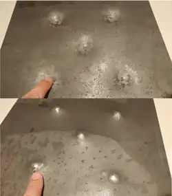 Placa de aço ARBL da marca Swebor, mostrando ambos os lados, após a deformação plástica ao ser atingida em um teste balístico. Nota: Quando exposto ao fogo, o aço primeiro se expande e, em seguida, perde a sua força, excedendo a temperatura crítica, a 538°C por ASTM E119 , a menos que tratado para ser à prova de fogo.