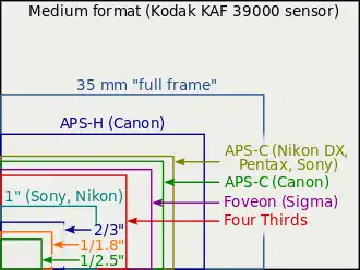O mais comum para referir-se ao tamanho dos sensores é usar um fator relativo ao do sensor full-frame. Esse fator é chamado "fator de corte" do sensor. A maioria das câmeras com sensor APS-C tem fator de corte em torno de 1,5, como nas Nikon, a 1,6, como nas Canon. Alguns modelos de Canon foram feitos com sensores com fator de corte 1,3, chamados APS-H. Então, o fator de corte (às vezes referido como um "multiplicador de comprimento focal", mesmo que a distância focal real seja a mesma) pode ser usado para calcular o campo de visão em termos de 35 mm a partir da distância focal real. As razões de multiplicador mais comuns:
