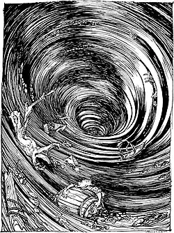 No conto um velho marinheiro conta a história de um naufrágio que sofreu num grande turbilhão (Maelström) nas costas da Noruega.